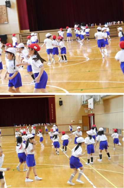 1年生では、楽しみながら身体を動かしての体力づくりです。忍者修行と題して、とんだりはねたりしています。