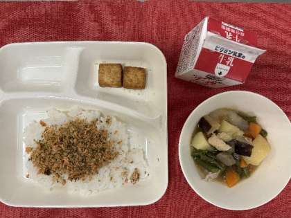 今日の献立は、鶏肉とじゃがいもの煮もの、あつあげのしょうゆだれかけ、紅ざけそぼろ、牛乳、ごはんでした。