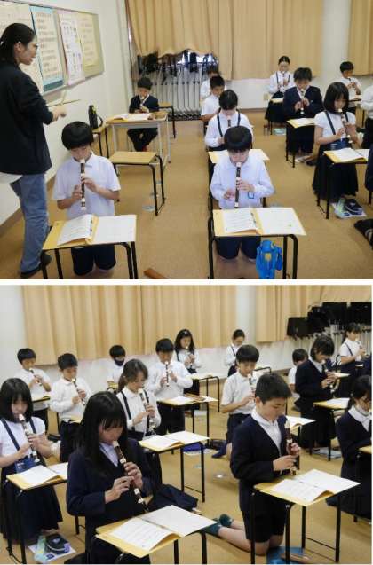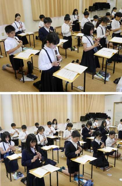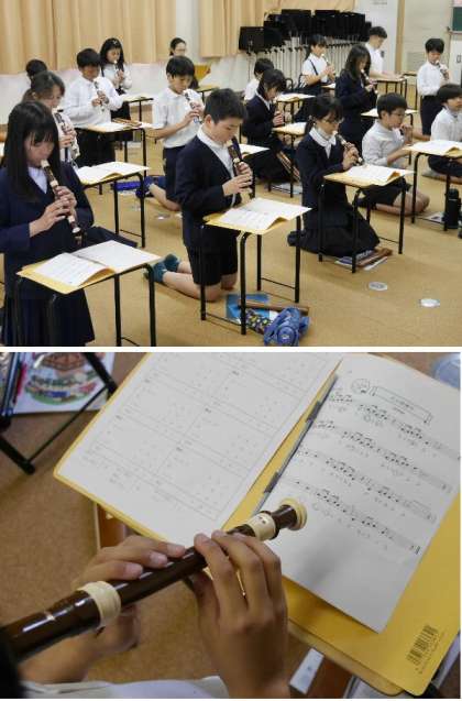 5年生が音楽室で、リコーダーで「こいのぼり」の練習をしていました。