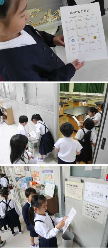 2年生が1年生をつれて、学校内の12か所の教室をたんけんします。