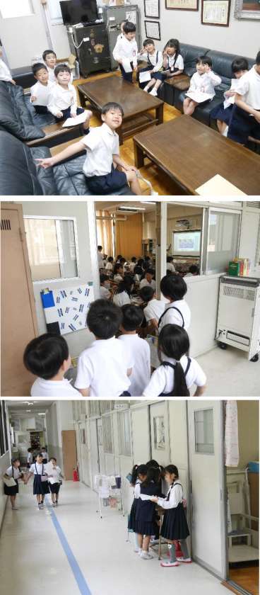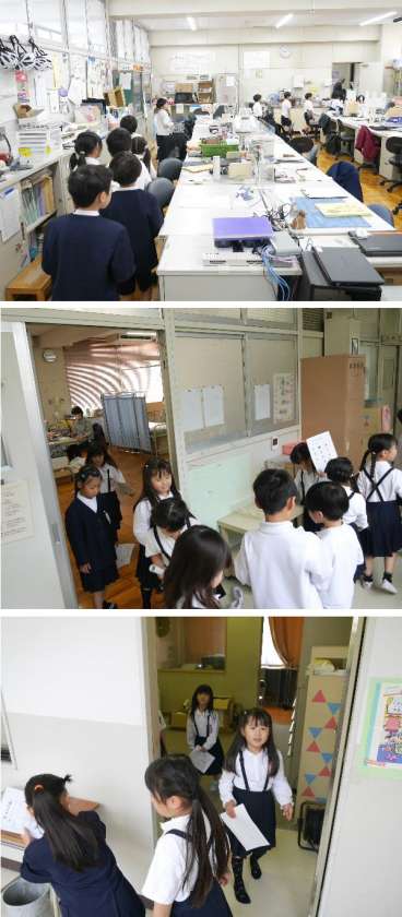 校長室、職員室、保健室、管理作業員室、なかよしプレイルーム、日本語教室、図書室、図工室、理科室、家庭科室、音楽室、放送室を回りました。