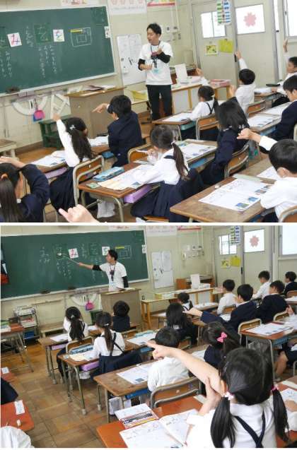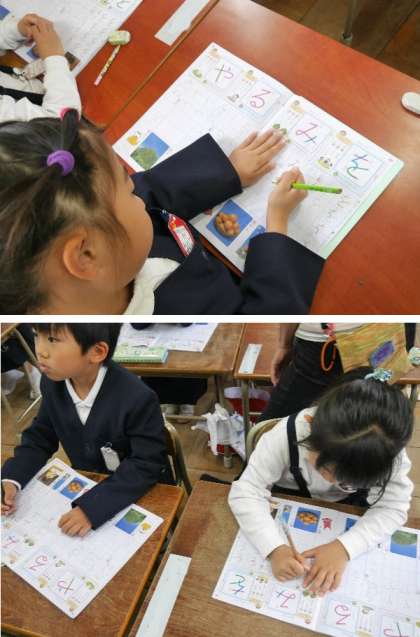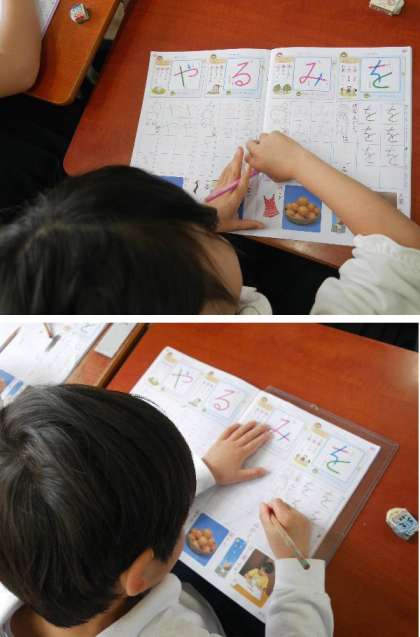 1年生では、毎日の国語でひらがなを学習しています。「を」「み」を書いています。指でなぞりって練習しています。もらがなの練習も終盤です。