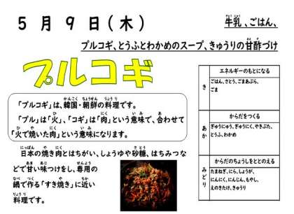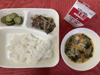 今日の献立は、プルコギ、とうふとわかめのスープ、きゅうりの甘酢づけ、牛乳、ごはんでした。