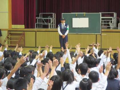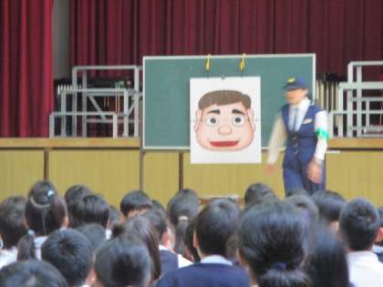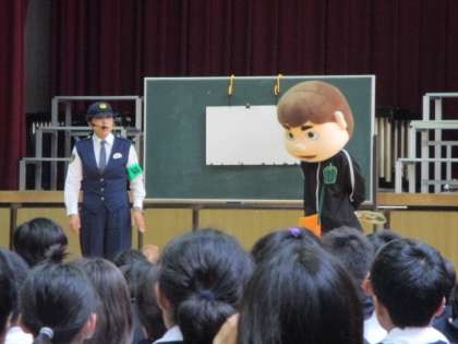 今日は、警察官の方々にもお越しいただき、小学生が誘拐されないようにするため、危険なときに助けを求められるようにするためのお話をしていただきました。