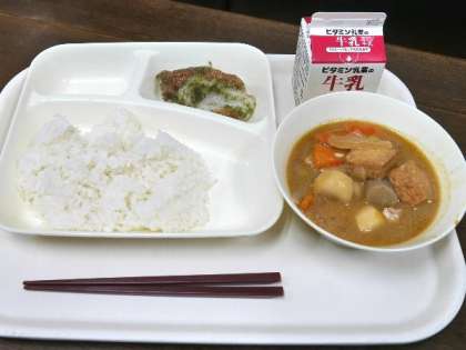 今日の献立は、ちくわのいそべあげ、あつあげとさといものみそ煮、あっさりキャベツ、牛乳、ごはんでした。