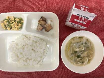 今日の献立は、さけのごまみそ焼き、五目汁、えんどうの卵とじ、牛乳、ごはんでした。