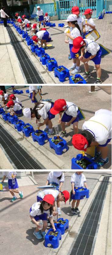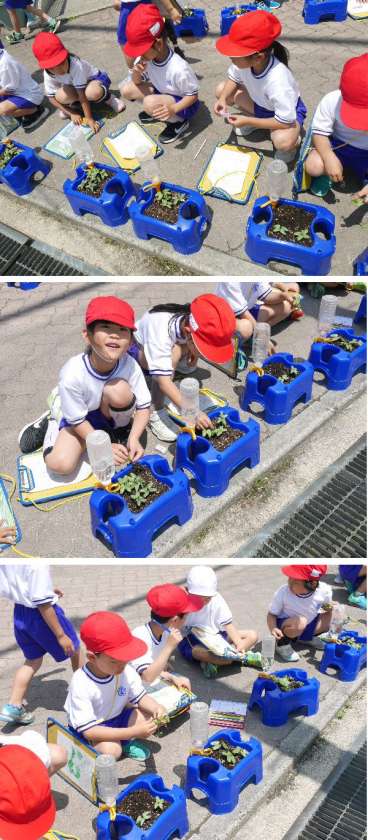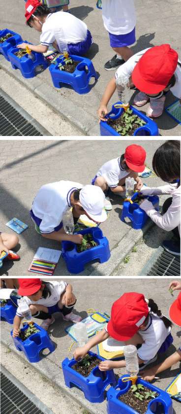 先週に1年生が植えたアサガオの種から芽が出てきました。じっくりと観察して絵を描いたあと、たくさん芽が出たので、いらない芽を間引きました。