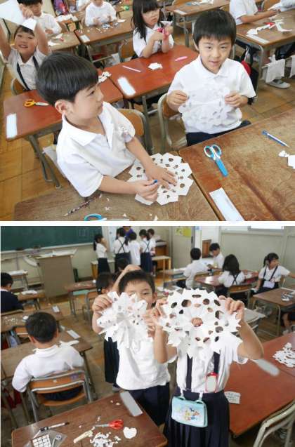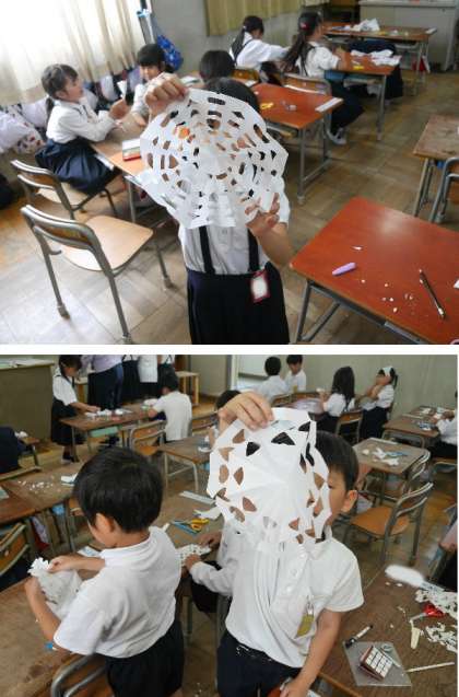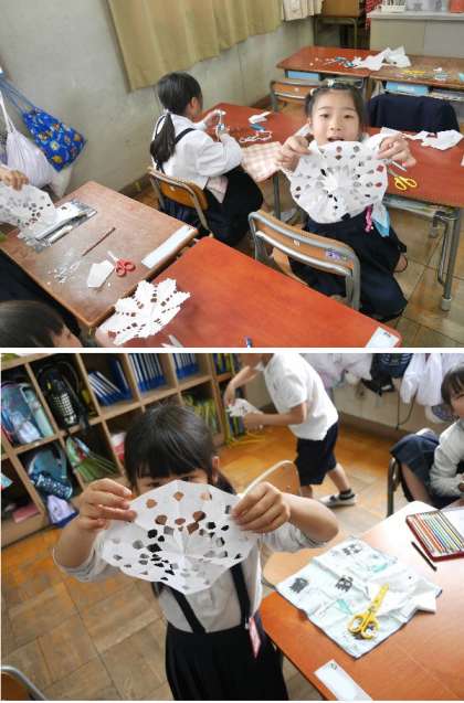 1年生が、紙を折りたたんで切り取ってひろげると、ふしぎな模様ができあがります。