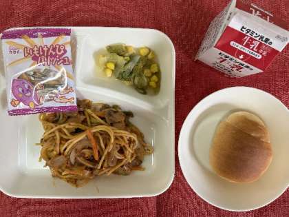 今日の献立は、ミートソーススパゲッティ、レタスとコーンのサラダ、いもけんぴフィッシュ、牛乳、ミニコッペパンでした。