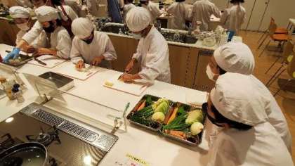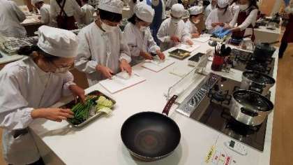 みんなで協力して調理実習をします。ポイントはゴミをいかに少なくするかです。