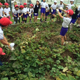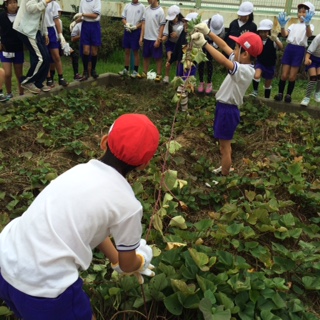 2年生全員で、第二グランドで育てていたサツマイモの収穫をしました。まずは、長く伸びた蔓を観察したり芋の掘り方を習ったりした後、芋掘り開始。大きな芋から小さな芋まで、形もさまざまな芋を掘り上げるたびに、大きな歓声を上げて喜んでいました。1年生を招いて行う《お芋パーティー》が楽しみです。