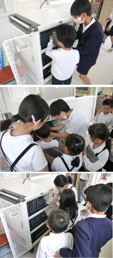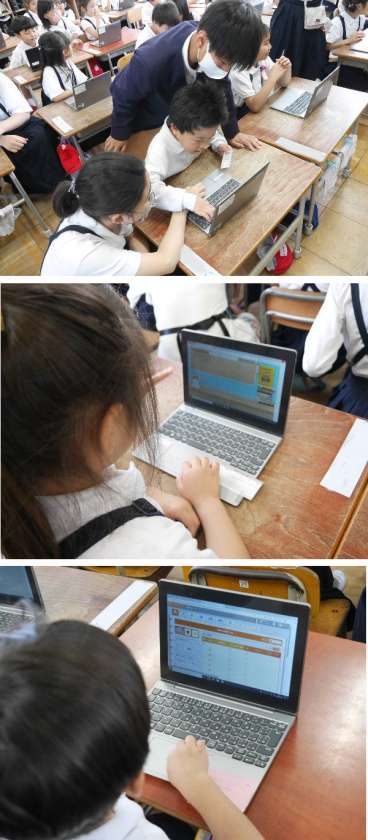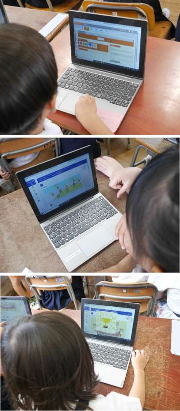 1年生が、6年生に教えてもらって学習端末のパソコンを使っています。ログインしてから、「心の天気」を入力して、デジタルドリルにもチャレンジしました。