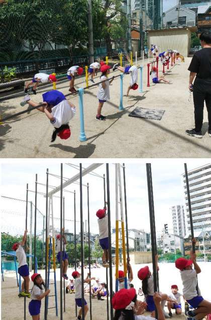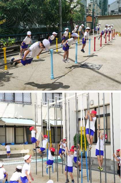 2年生が運動場で、のほり棒や鉄棒を使って運動しています。今日はとてもいい天気で、気持ちいいですね。