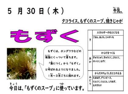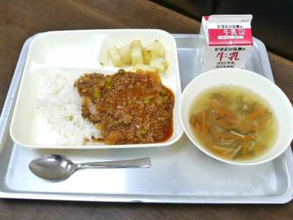 今日の献立は、タコライス、もずくのスープ、焼きじゃが、牛乳でした。