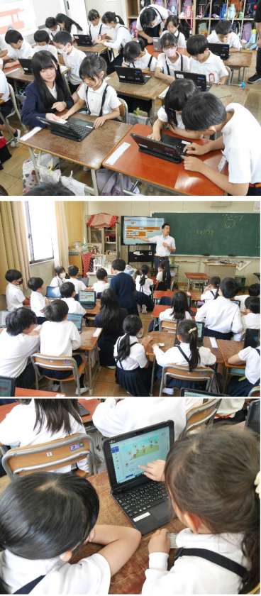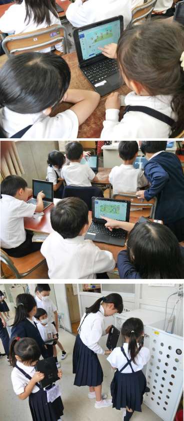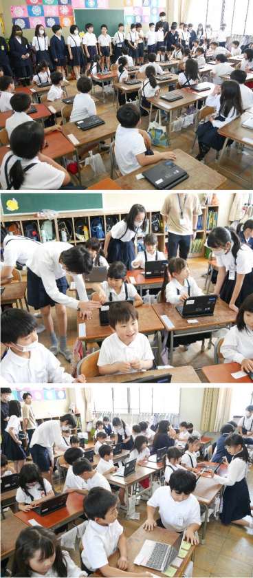 1年生では、順番に一人一台学習端末パソコンが使えるように、6年生が来てくれて、電源オン、ログイン、心の天気、デジタルドリルなどを体験しました。