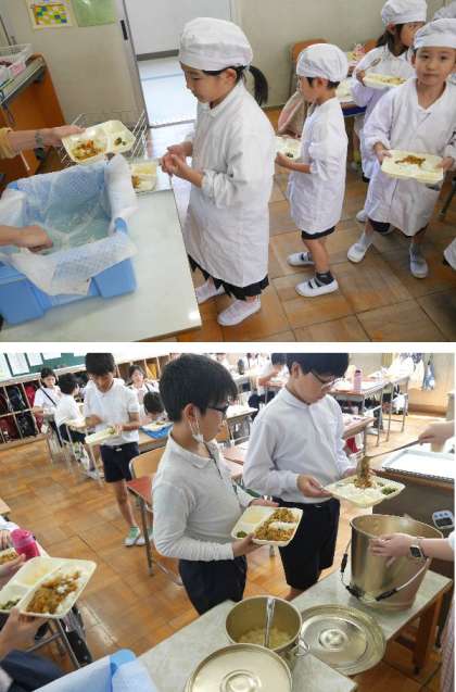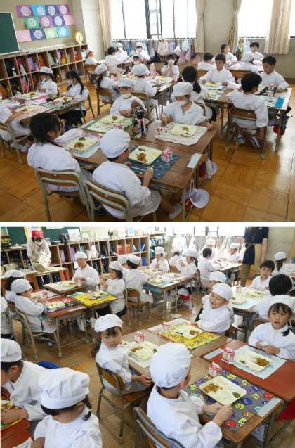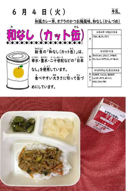 今日の献立は、和風カレー丼、オクラのかつお梅風味、和なし(缶)、牛乳でした。カレー丼はみんな大好きです。