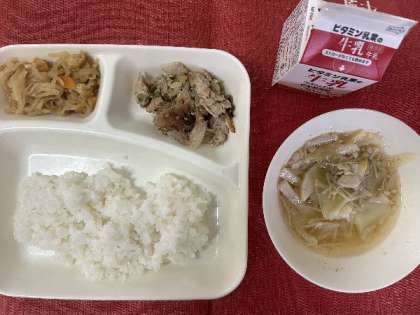 今日の献立は、豚肉のごまみそ焼き、すまし汁、切干しだいこんのいため煮、牛乳、ごはんでした。