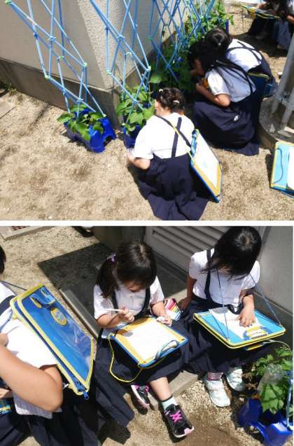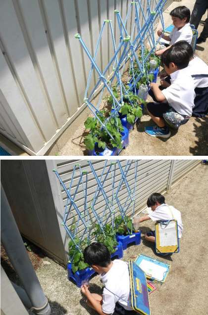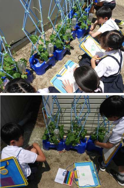 1年生では生活科で育てているアサガオの観察や追肥をしたりしていました。