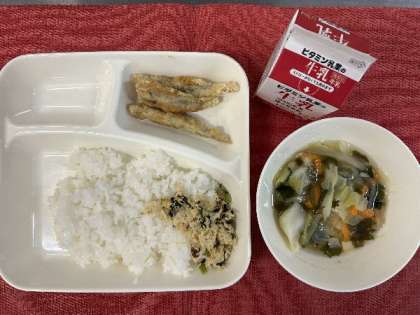 今日の献立は、いわしのてんぷら、五目汁、とり菜っ葉いため、牛乳、ごはんでした。