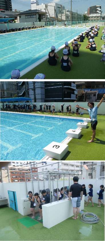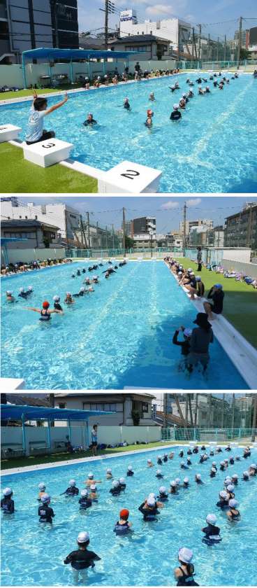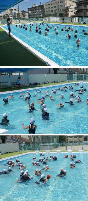 3年生のプール学習です。楽しい音楽とともに、プールの中で踊って、水になれる学習をしていました。