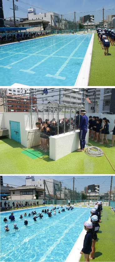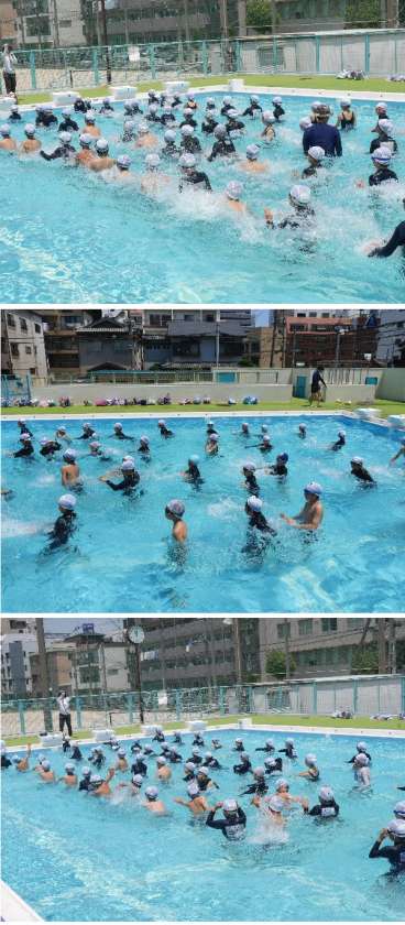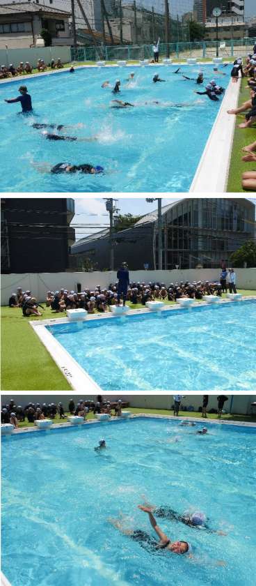 4年生のプール学習です。水になれる運動のあと、クロールなどの練習をして、どれだけ泳げるかチャレンジしていました。25mを泳げる人もたくさんいます。