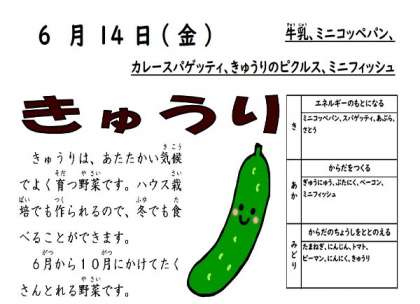 今日の献立は、カレースパゲッティ、きゅうりのピクルス、ミニフィッシュ、牛乳、ミニコッペパンでした。