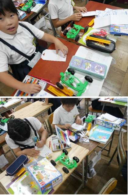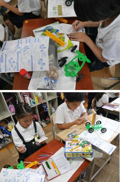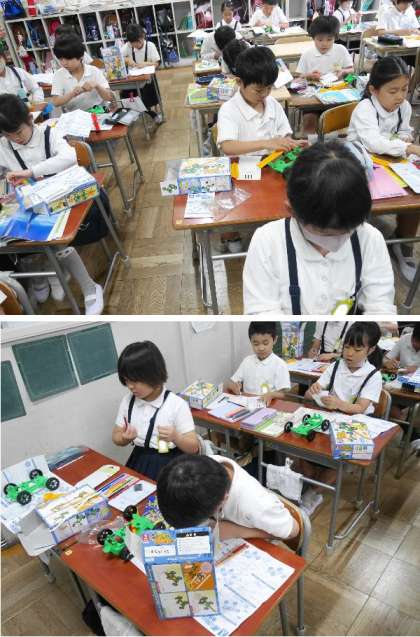 3年生の理科では、風やゴムのはたらきを調べるため、風やゴムで動く自動車を使って調べていきます。キットの自動車を組み立てて完成させます。