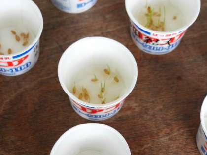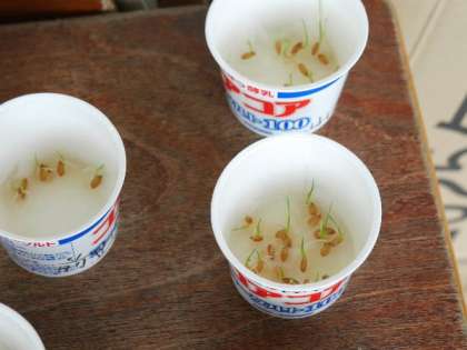 5年生では、種もみから稲を育てる学習をします。種もみから芽がでてきました。これが育って稲穂になるんですね。