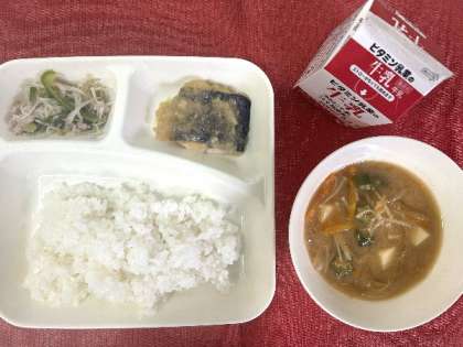 今日の献立は、さごしのおろしじょうゆかけ、みそ汁、野菜炒め、牛乳、ごはんでした。