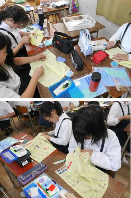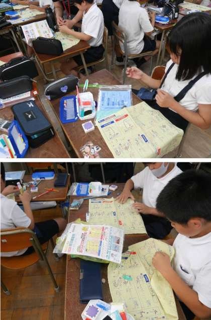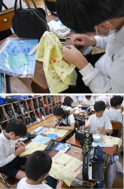 5年生の家庭科では、裁縫の基本となる、玉結び、玉どめにチャレンジをしています。糸で名前をカタカナでぬいとったり、悪戦苦闘しながらがんばっています。