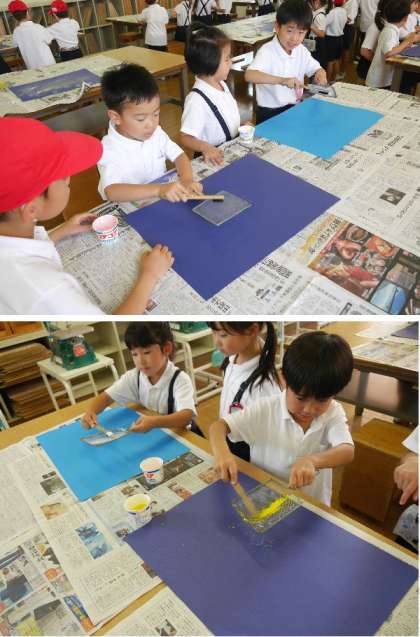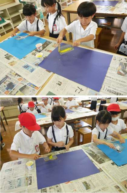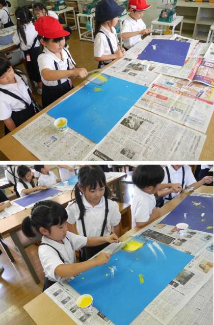 1年生が図工室で、色画用紙にぶらしで絵の具をとばして「ふしぎな海の世界」を作っていました。