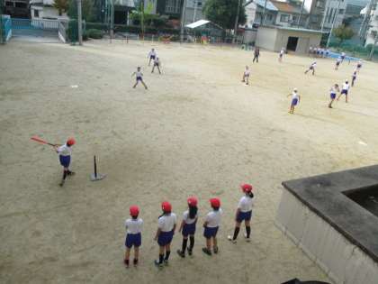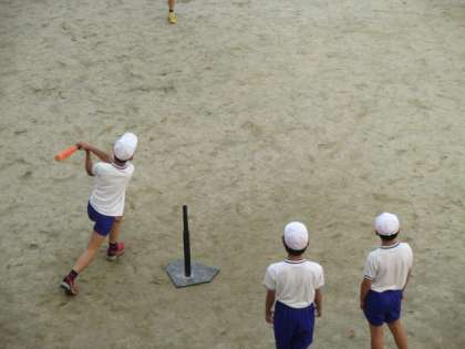 昨日は4年生がラケットで打つベースボール型ゲームをしていましたが、今日の5年生は、ティーを使ってプラスチック製バットで打っています。子どもの実態に応じて、いろいろな道具を使ったりやルールを工夫したりします。