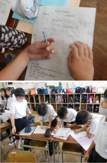 5年生の英語では、「〜曜日に何があるか」と友だちに聞いて、答えを聞いて書いていました。英会話のコミュニケーションの練習ですね。