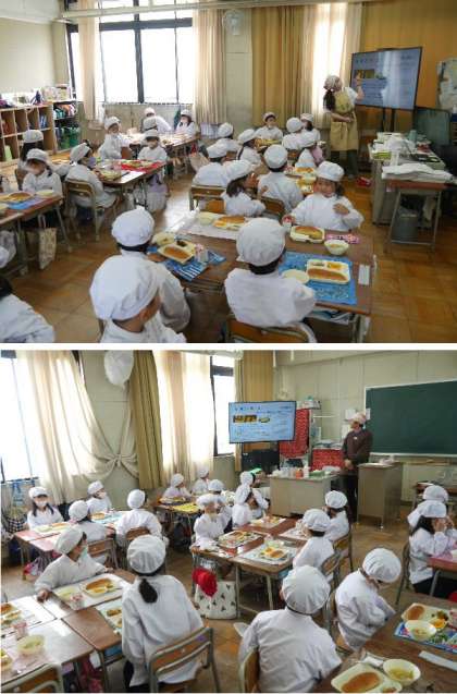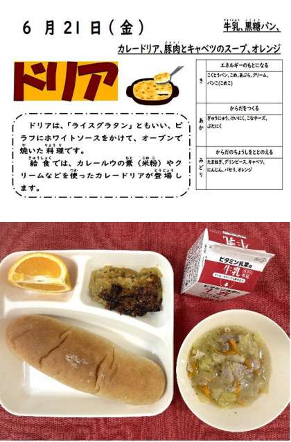 今日の献立は、カレードリア、豚肉とキャベツのスープ、オレンジ、牛乳、黒糖パンでした。