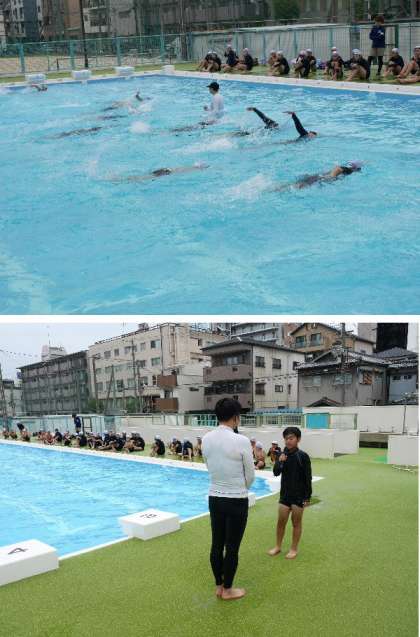 6年生の水泳授業に、都島区の事業の一環として、元オリンピック選手の千葉すずさんがきていただきました。クロールと平泳ぎについて、具体的な手や足の動かし方や、息継ぎのしかたをわかりやすく教えていただき、練習をしました。最後に児童代表からお礼の挨拶をしました。ありがとうございました。