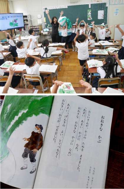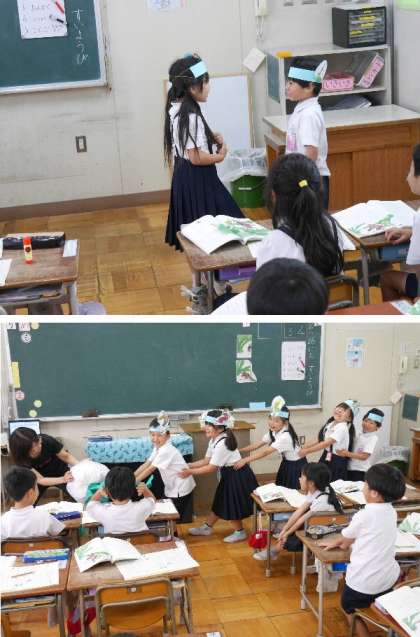 1年生の国語では、「おおきなかぶ」を学習しています。物語の場面を、みんなで役割をして物語の流れをつかんでいきます。