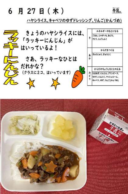 今日の献立は、ハヤシライス、キャベツのゆずドレッシング、りんご(缶)、牛乳でした。今日のハヤシライスには、星がたのラッキーにんじんが各学級に2枚はいっていました。