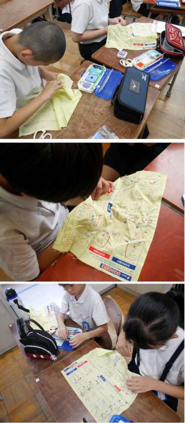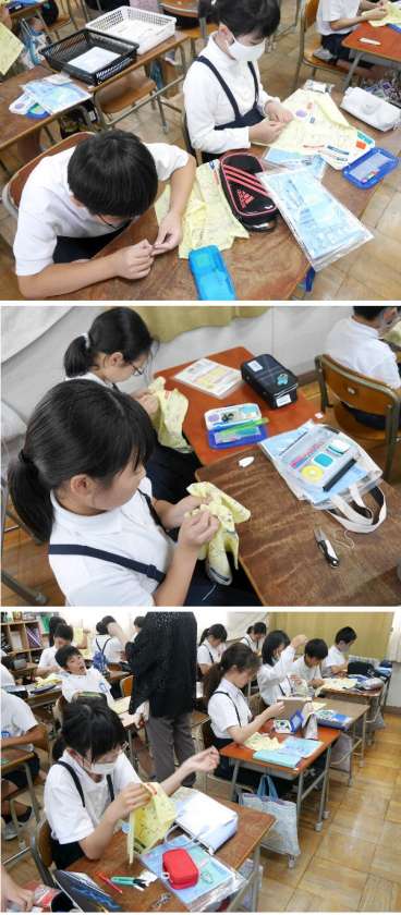 5年生の家庭科では、裁縫道具を使って、練習用布を使って、いろいろな裁縫を練習しています。最初に、針に糸を通して、玉むすびして、布に糸を通していきます。最後に玉どめをして完了です。手先の器用さがもとめられる作業ですね。あせらず、おちついてやってみましょう。