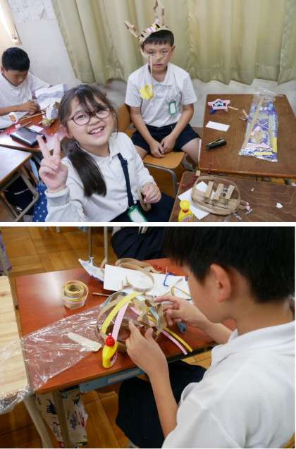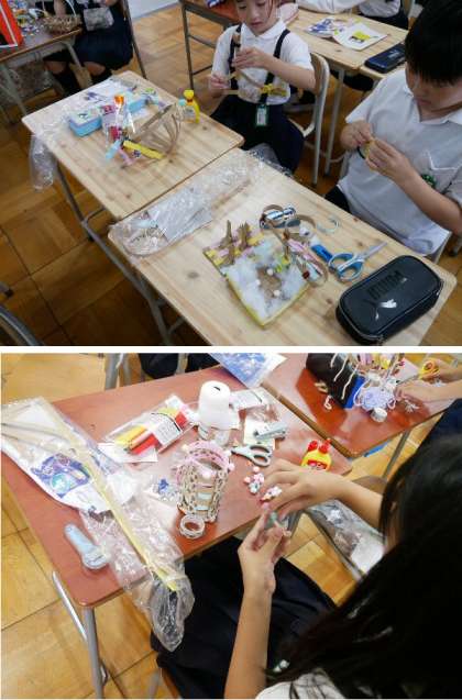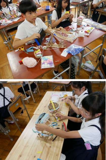 4年生の図工では、厚い紙のテープを使って、つないだり組んだりして作品づくりをしていました。入れ物かごや帽子をつくっている人が多いです。