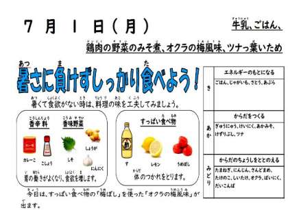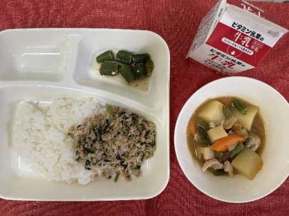 今日の献立は、鶏肉の野菜のみそ煮、オクラの梅風味、ツナっ葉いため、牛乳、ごはんでした。