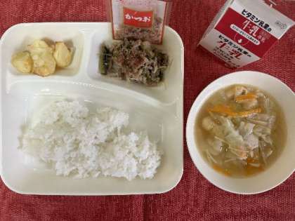 今日の献立は、ゴーヤチャンプルー、かつおぶし、五目汁、あげ焼きじゃが、牛乳、ごはんでした。