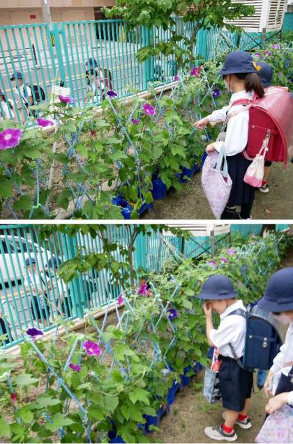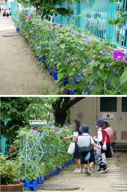 1年生が生活科で育ててきたアサガオもすくすくと生長し花が咲きました。子ども達が朝登校すると、自分のアサガオを見に来ています。