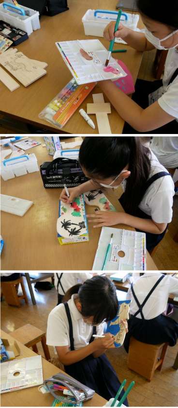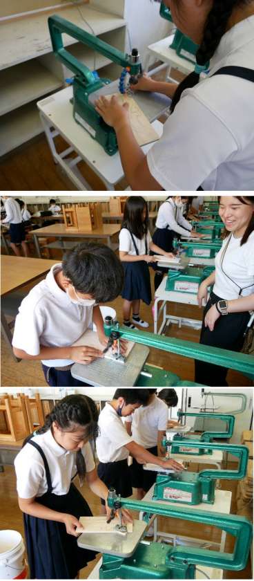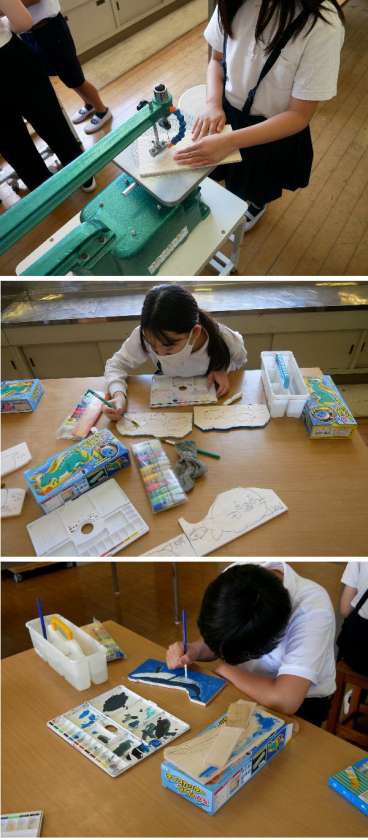 6年生の図工では、テープカッターをデザインして作っています。デザインした板を電動のこぎりで切って、色を塗っていました。