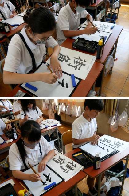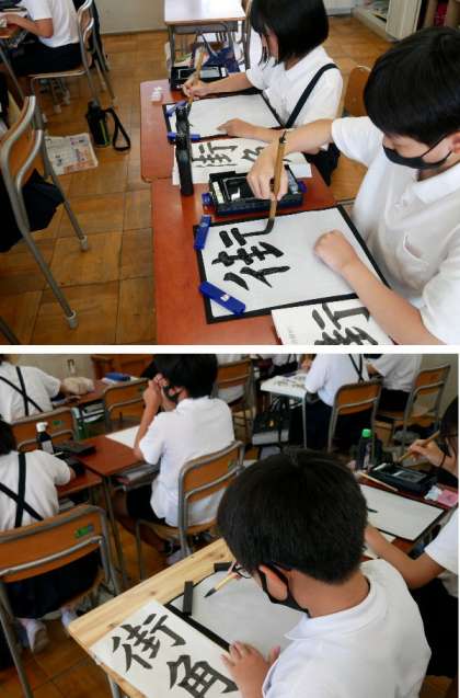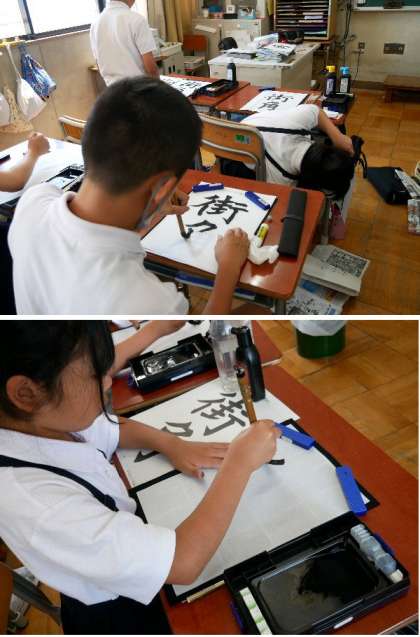 6年生が習字で「街角」と書いていました。画数が多くてバランスが難しいですね。見本をたよりに、ていねいに書きましょう。
