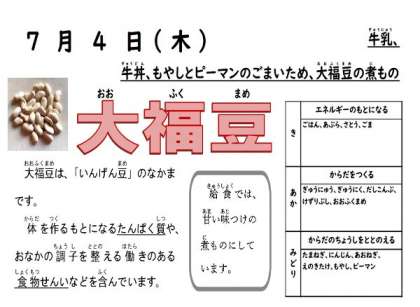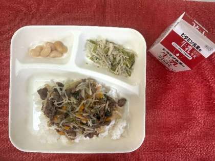 今日の献立は、牛丼、もやしとピーマンのごまいため、大福豆の煮物、牛乳でした。