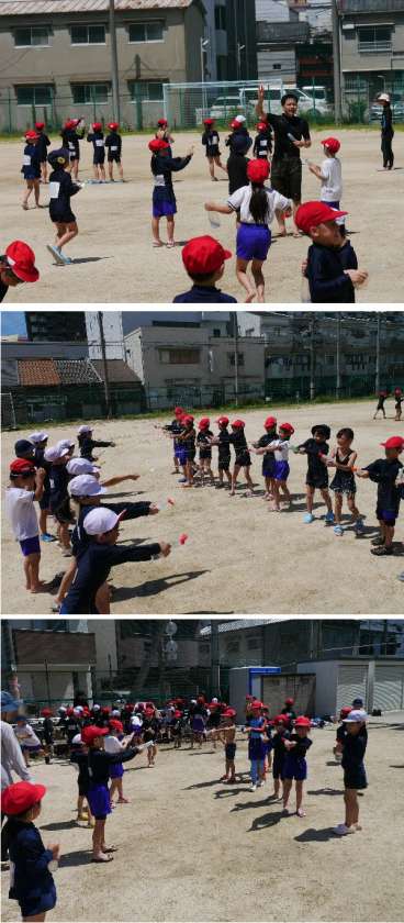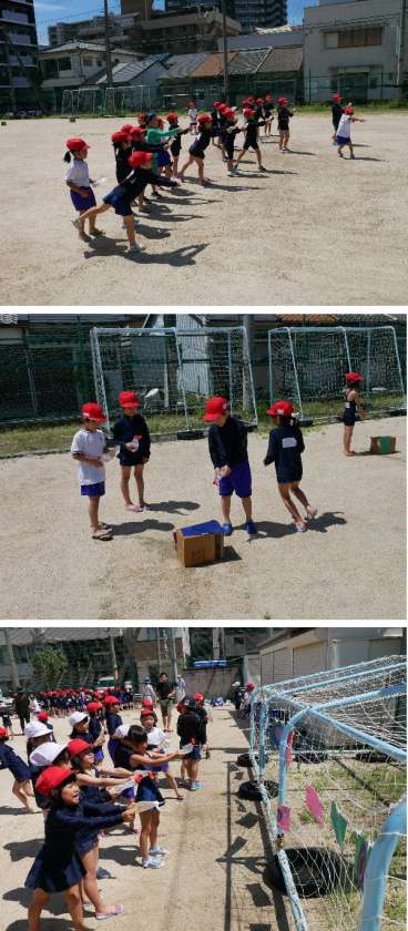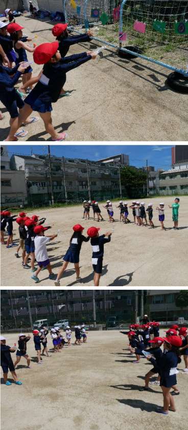 1年生は、プールの前に、第2グランドで水あそびをしました。お家からペットボトルなどを持ってきて、水を入れて、水を押し出してとばして遊びました。遠くまでとばしたり、かけあったり、とても元気よく楽しんでいました。