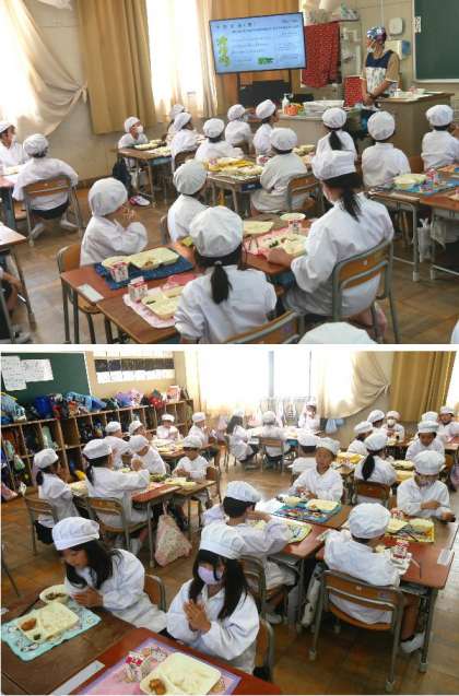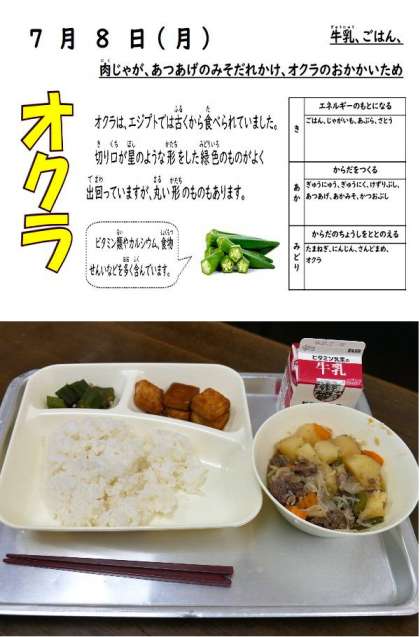 今日の献立は、肉じゃが、あつあげのみそだれかけ、オクラのおかかいため、牛乳、ごはんでした。