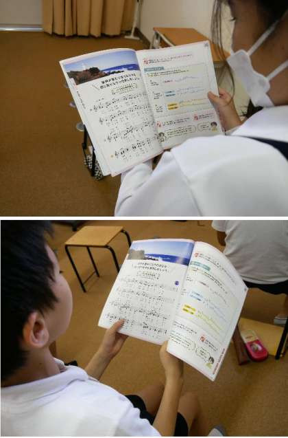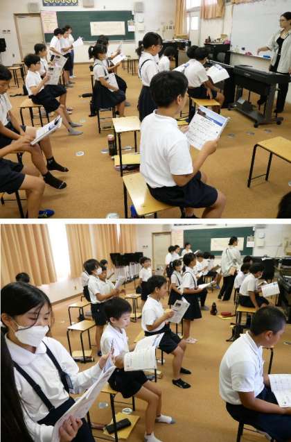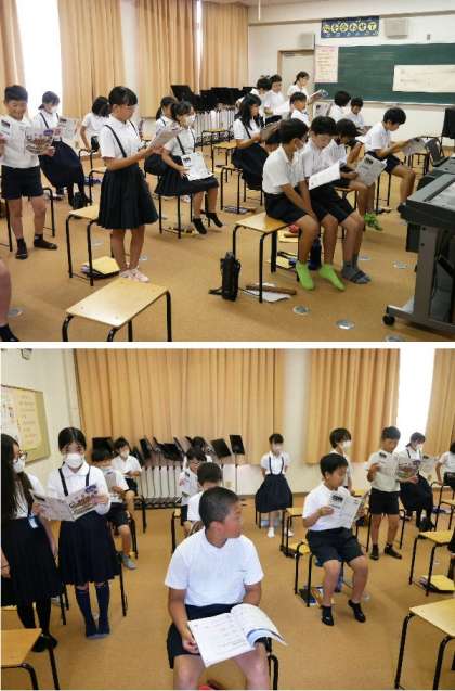 5年生の音楽では、歌声が重なり合うひびきを感じ取りながら合唱の練習をしていました。歌は「いつでもあの海は」です。