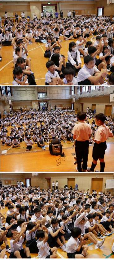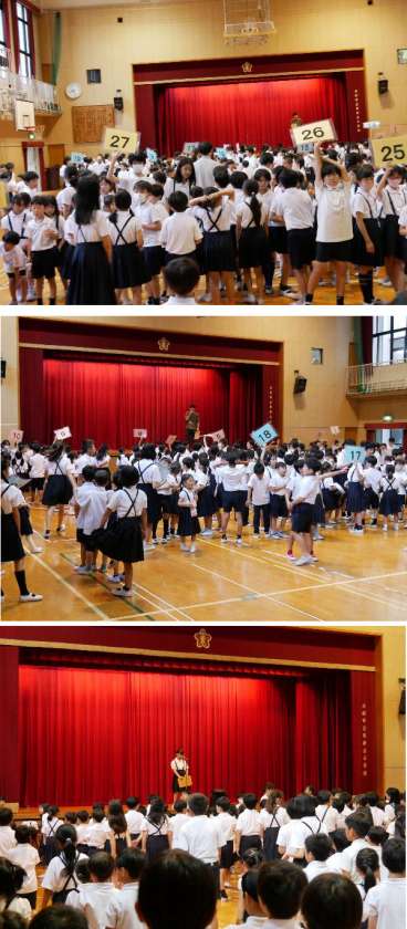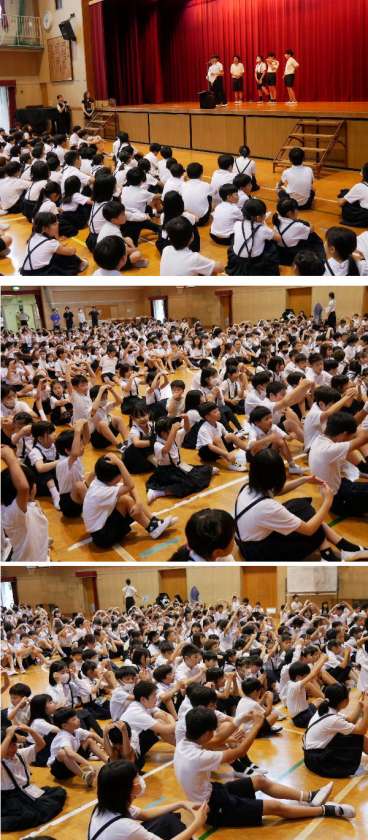 今日の児童集会は講堂で行われました。集会委員による音楽の曲名をあてるまるばつクイズでした。