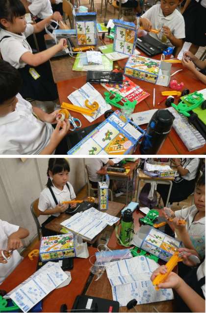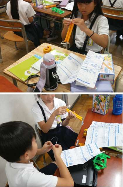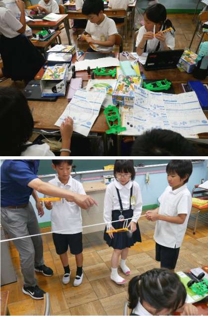 3年生では、かぜやゴムのはたらきを学習するために、自動車もけいで実験して学習しています。ゴムでプロペラを回しています。